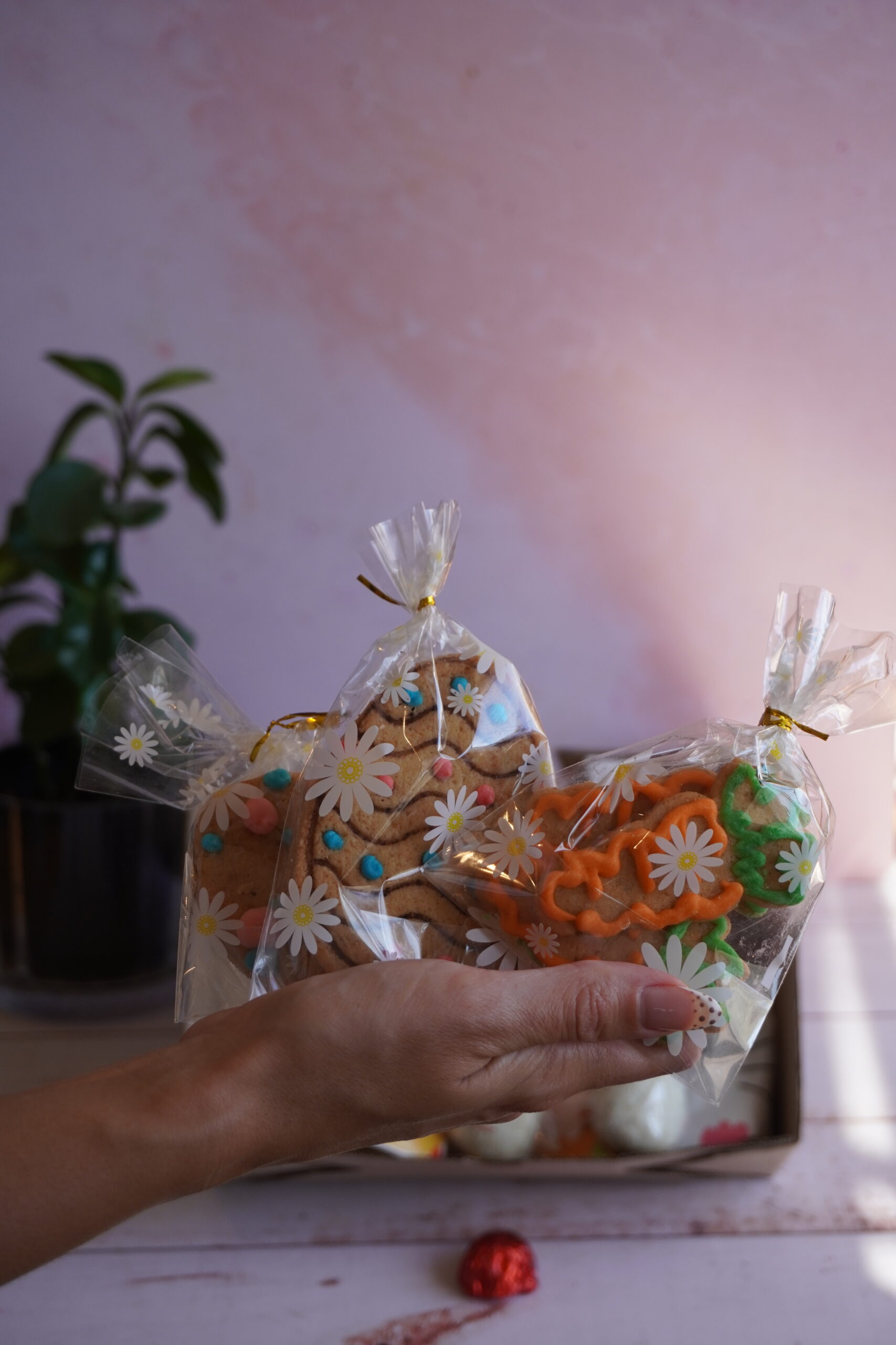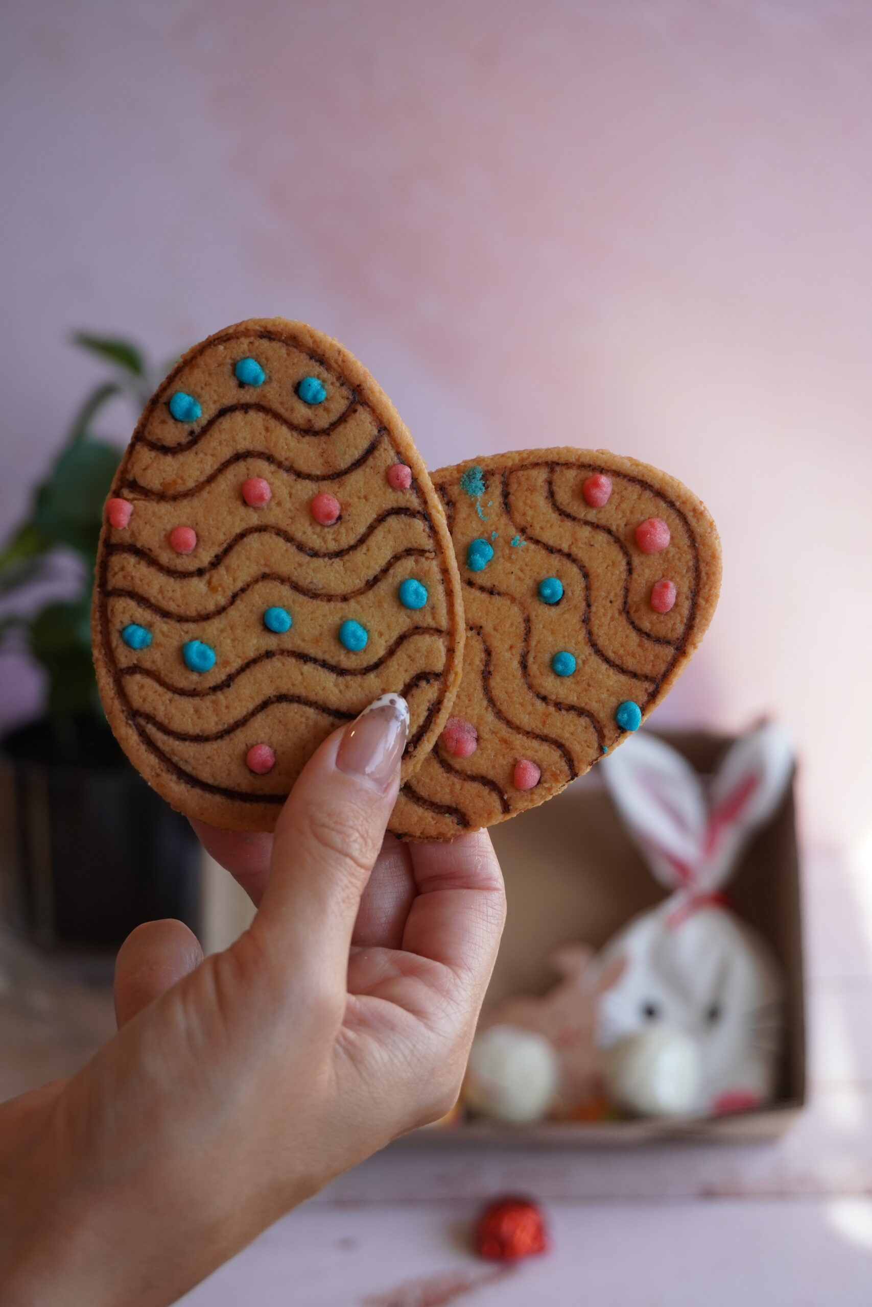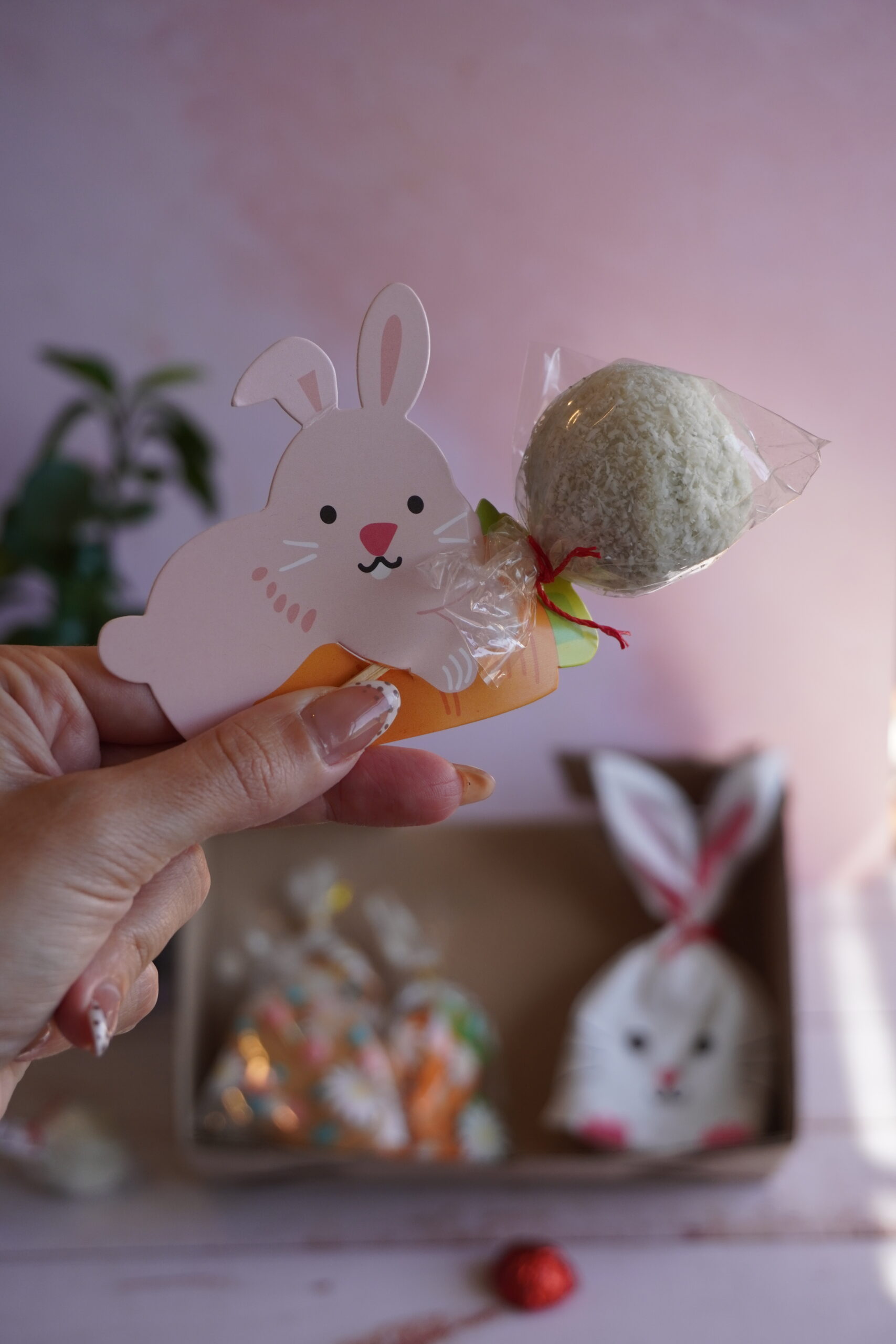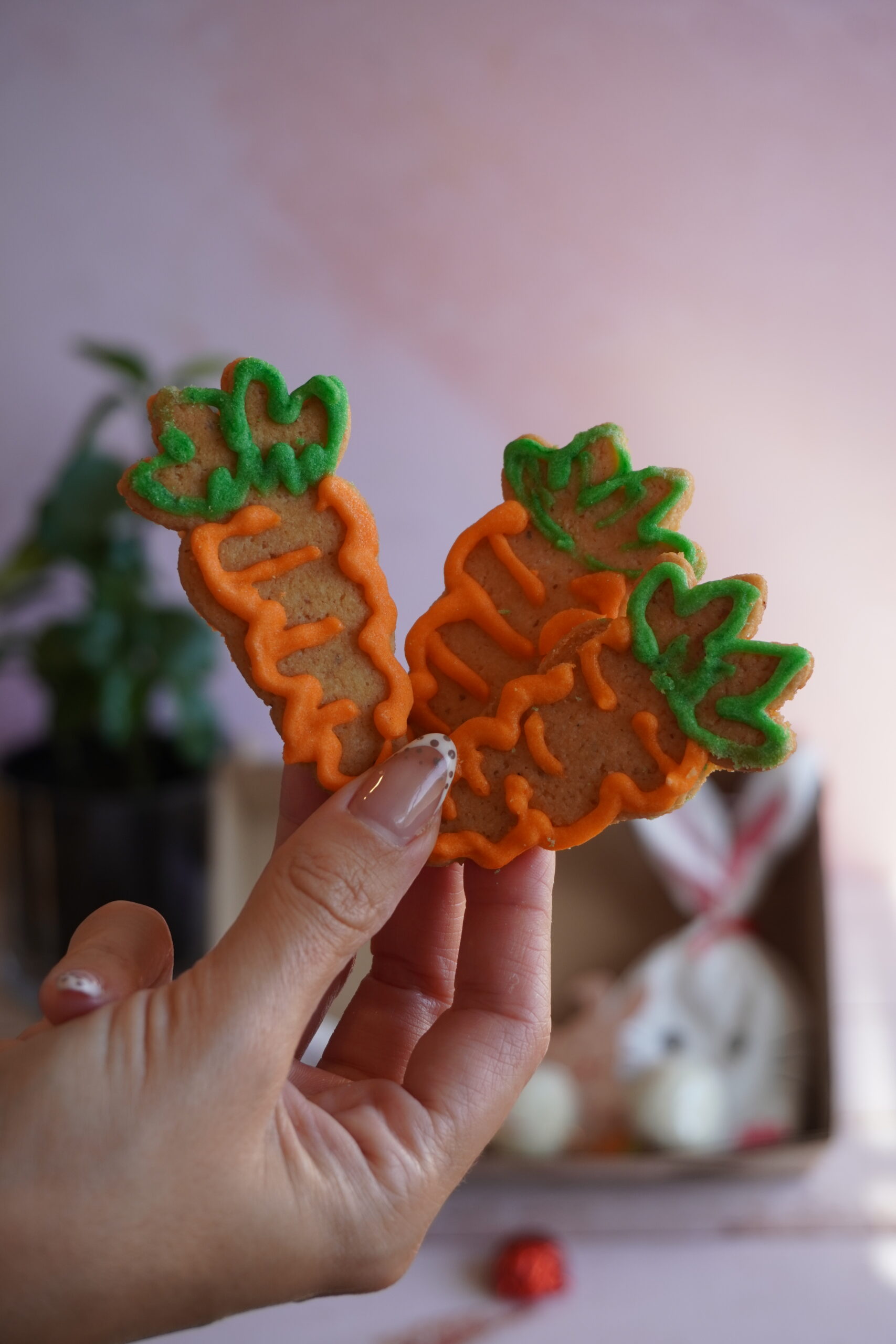 🥕 7 cookies keto decoradas con glasé de eritritol, con formas alusivas de zanahoria y huevo de Pascua. 🐣 Cajita con forma de conejo rellena con pequeños bomboncitos en forma de huevito. 🍫 3 bombones en forma de huevo, rellenos de dulce de leche sin azúcar y nuez. 🐰 3 cake pops conejito de carrot cake, suaves, húmedos y con el toque especiado típico de esta torta clásica.