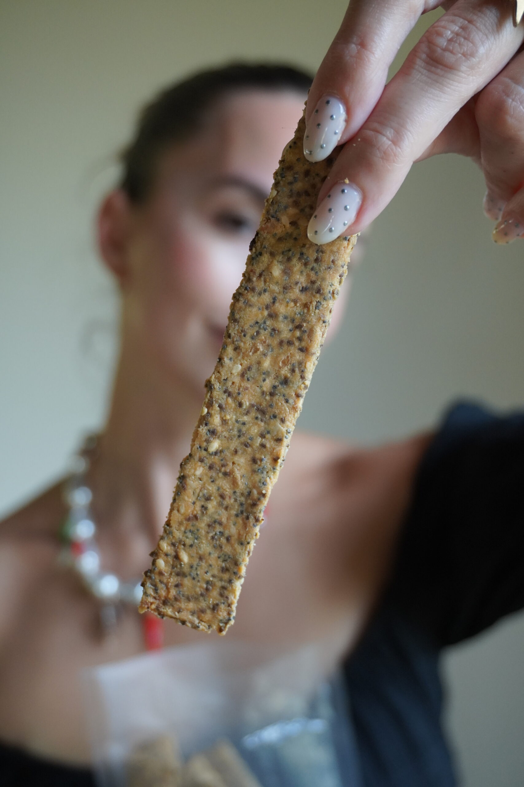 Snack crocante elaborado con semillas de lino, chía, girasol y sésamo, combinado con harina de almendras y aceite de oliva.